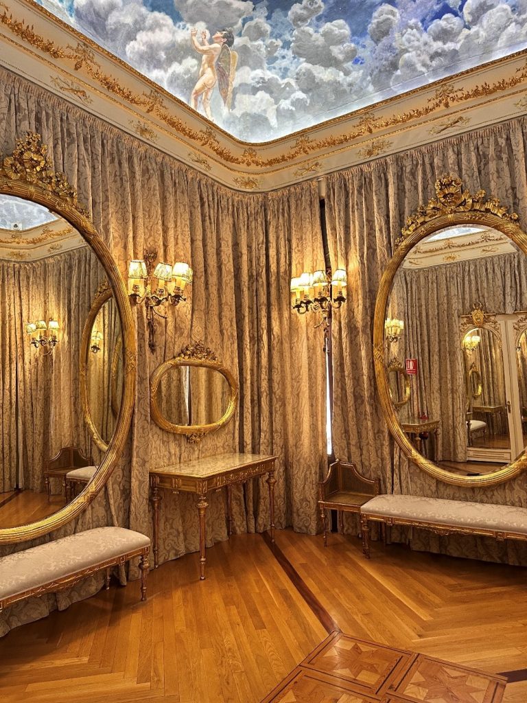 The gold and brass chandeliers that illuminate the hall originate from Miramare Castle in Trieste, once the residence of Archduke Maximilian of Habsburg. After appearing – somewhat unexpectedly – on the Paris art market, they were purchased by the Casino’s members and brought to Murcia. These were the city’s first electric chandeliers, which at the time posed a significant technical challenge. Despite numerous later restorations, the original wooden dance floor has been preserved to this day.